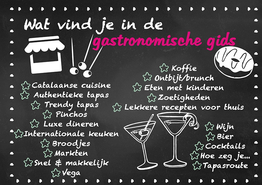 De Gastronomische Gids geeft je de beste en de meest lokale tips om een hapje te gaan eten of wat te drinken in Barcelona. De hotspots zijn ingedeeld op thema. Door middel van een navigatiesysteem kom je heel gemakkelijk bij het onderwerp naar keuze. In de gids (een PDF bestand van 100 pagina’s) worden tips in de volgende thema’s behandeld: Ontbijt & Brunch, Koffie, Dulces, Leuk & lekker voor kids, Broodjes, Snel & makkelijk, Authentieke tapas, Trendy tapas, Pinchos, Catalaanse cuisine, Markten, Bijzonder dineren, Internationale keuken, Luxe dineren, Vegetarisch & Veganistisch, Drankjes, Catalaanse bieren, Cava & wijnen, Tapasroute.